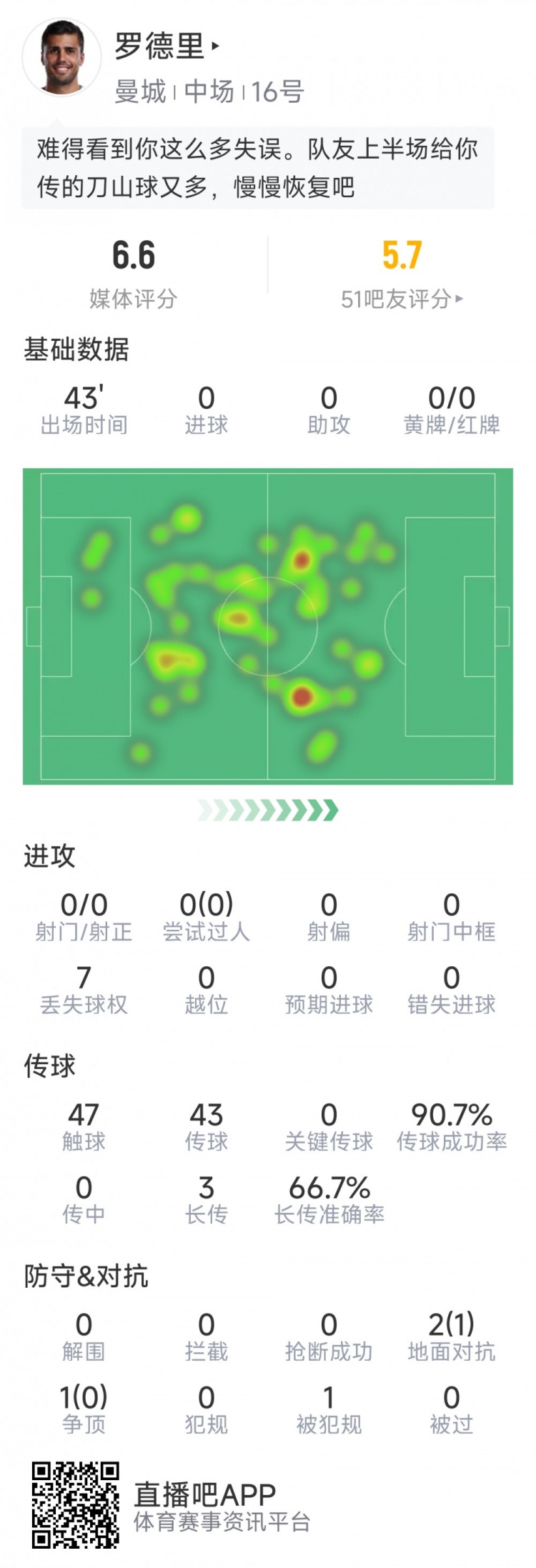 9月15日讯 本轮英超曼市德比半场战罢,曼城1-0领跑 ,欧洲杯直播以下为罗德里半场数据: