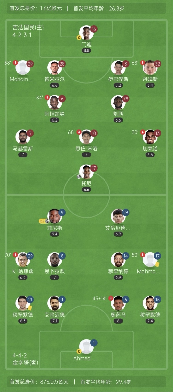 本场赛事 ,吉达国民队内门迪、马赫雷斯、伊万-托尼等十名外援全部先发,只有右后场球员穆罕默德-阿卜杜拉赫曼是沙特本土球员。吉达国民杆位身价是对手18倍多。