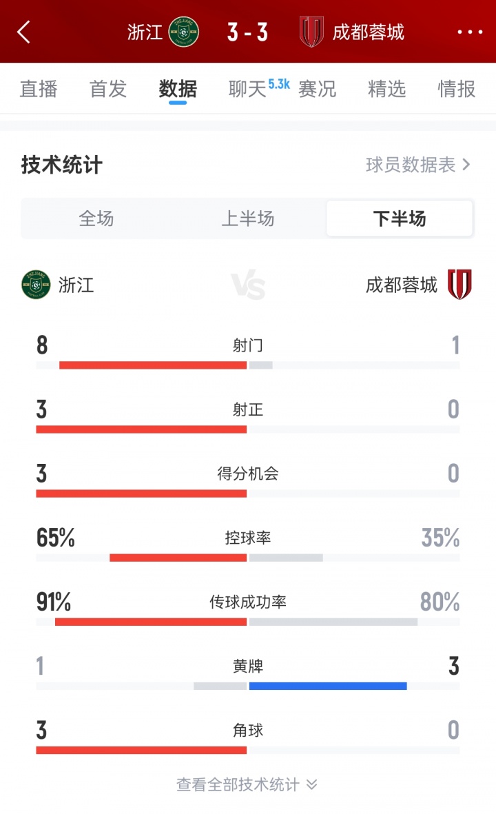上半场赛事 蓉城一度3-0领跑 ,被浙江追成3-2平。
