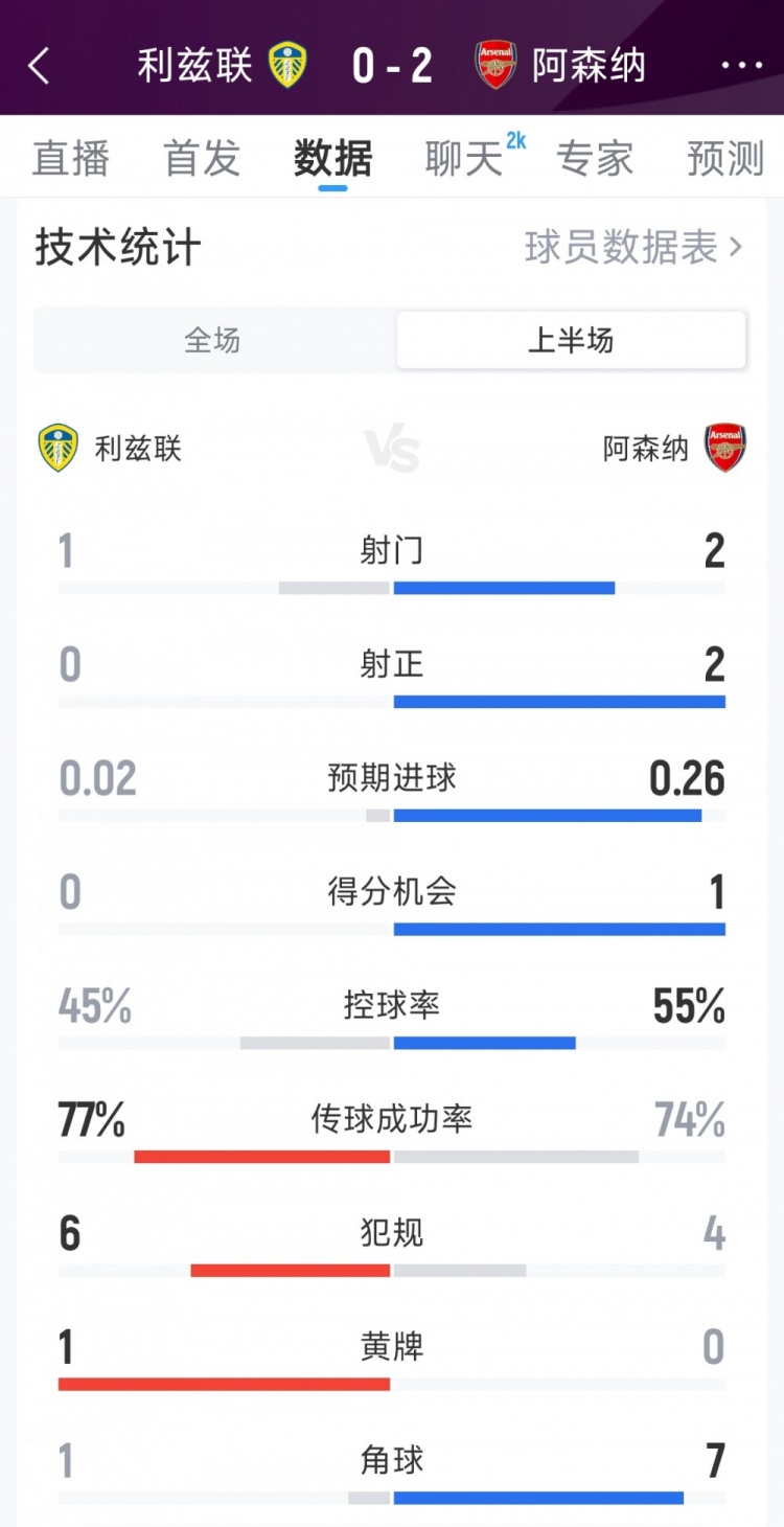 1月31日讯 本轮英超阿森纳对阵利兹联上半场战罢,枪手暂时2-0领跑 ,欧洲杯直播吧以下为双方半场数据对比: