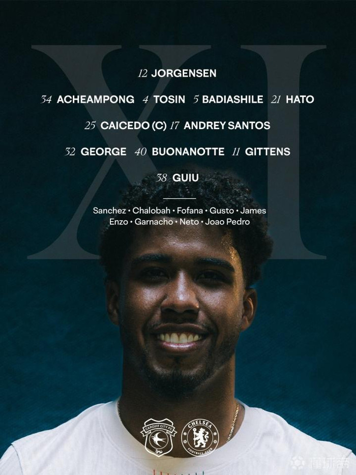 切尔西杆位:12-约恩森、34-阿昌庞、4-阿达拉比奥尤、5-巴迪亚西勒、21-哈托、25-凯塞多、17-安德雷-桑托斯、32-乔治、40-博纳诺特、11-吉滕斯、38-吉乌