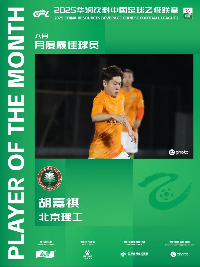 9月25日讯 官方消息,北京理工中场球员胡嘉祺当选中乙职业联赛 8月最佳球员。