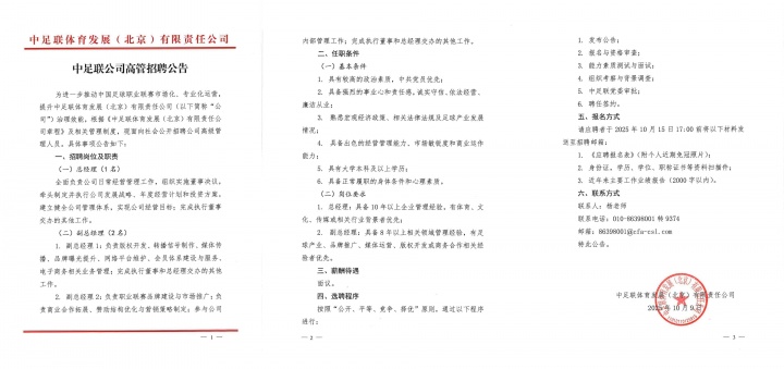 9日晚,中足联官方发布通知,中足联体育进步 (北京)有限责任公司透明 招聘总经理(1人)、副总经理(2人),共3名高管。而据了解,这只是中足联内部人员调整工作的一部分。中足联接下来将组织一次全面内部人员招聘,欧洲杯直播吧招聘岗位不仅限于作为中足联经营机构的中足联公司,还涉及中足联其它相关职能部门,如竞赛、裁判 、女子等部门。