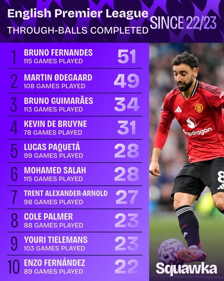 10月13日讯 根据数据机构Squawka的统计,自2022/23赛季以来,欧洲杯直播B费在英超职业联赛 中以115场赛事 完成51次成功直塞的数据高居榜首。厄德高以108场赛事 送出49次直塞的成绩紧随其后,位列第二。
