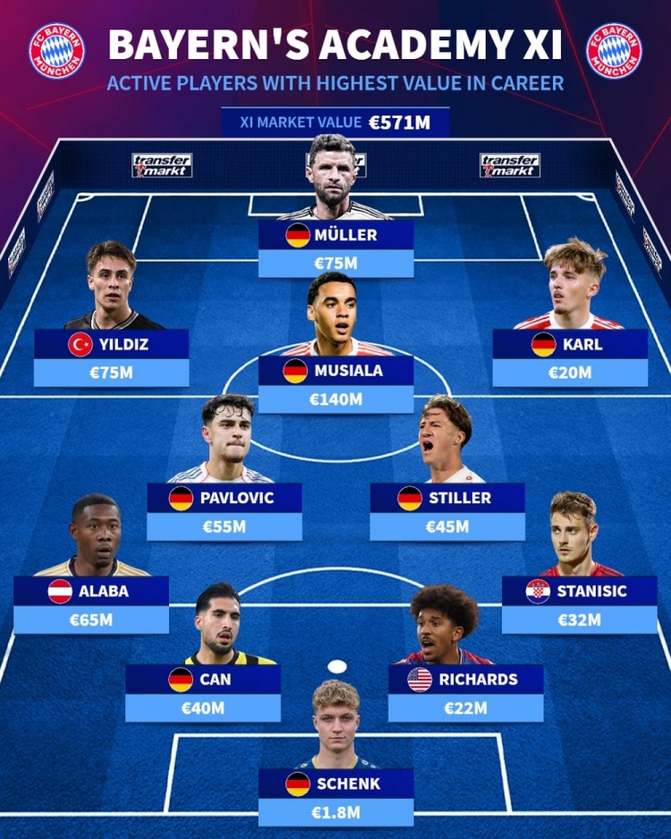 10月29日讯 德国转会市场根据拜仁青训出身现役球员的历史最高身价,列出身价最高阵形 ,足球直播无插件免费在线观看穆勒、穆西亚拉、伊尔迪兹在列。